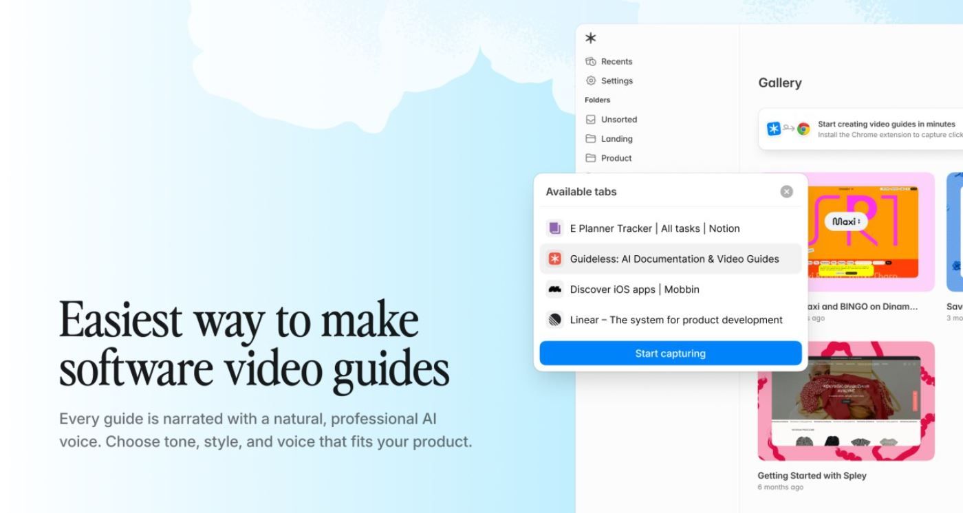 Guideless works directly in your browser and produces guides that look clean and sound premium by default. No screen recording setup, no timeline editing, no scriptwriting. Teams use it for customer onboarding, employee training, product walkthroughs, and support documentation.